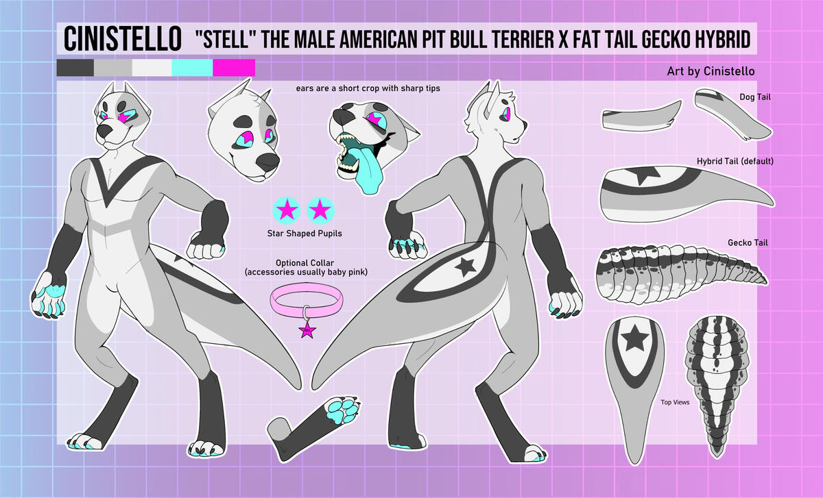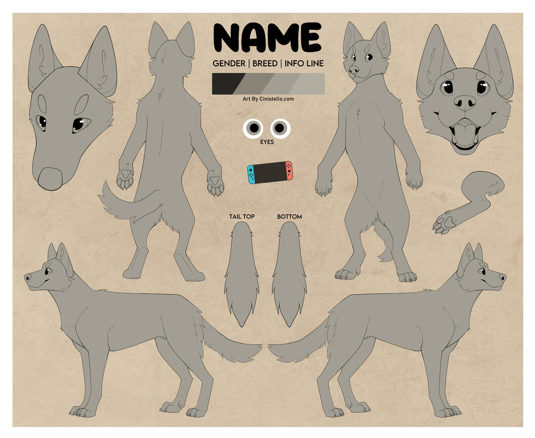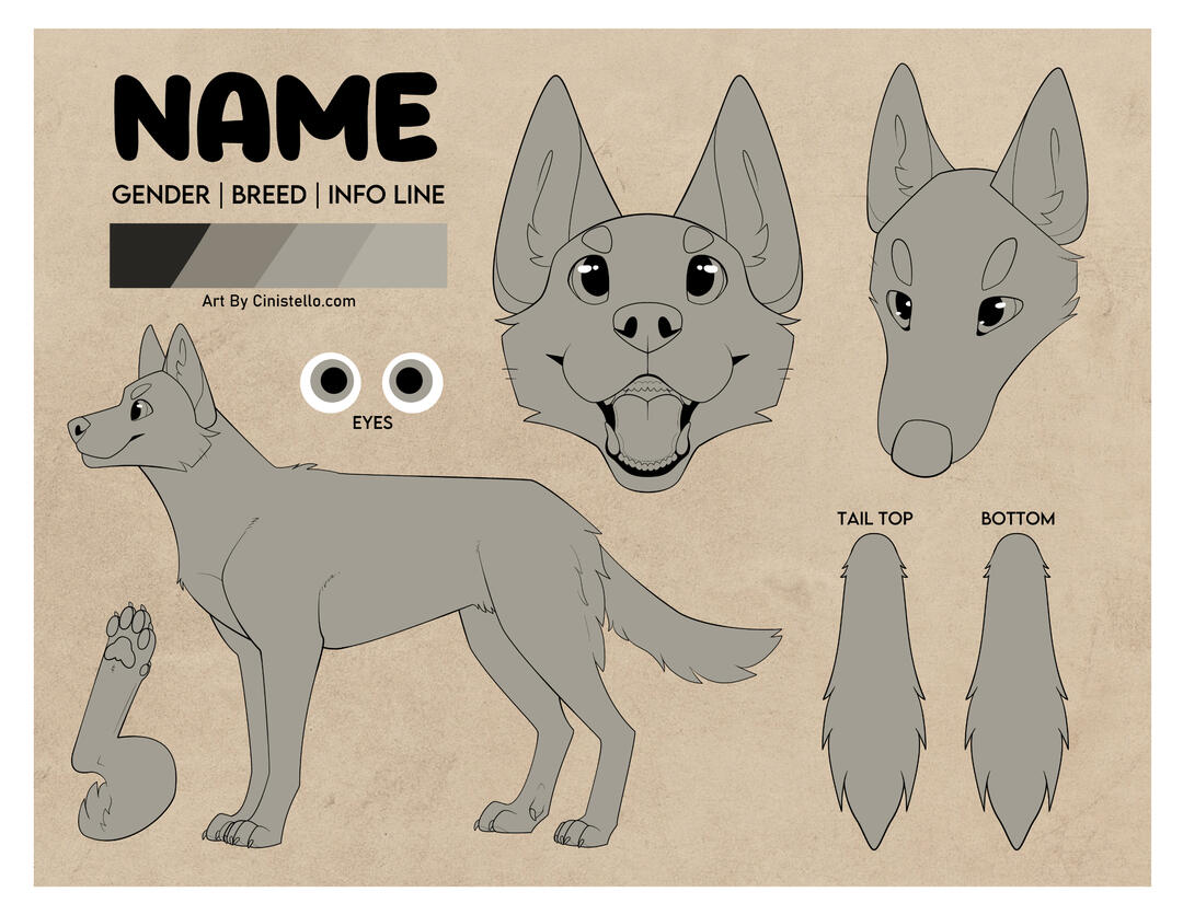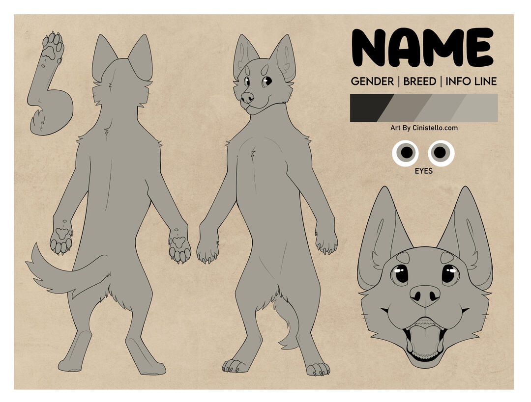 This includes all poses seen; front/back standing, side view, tail closeups, two headshots, bottom of foot, and an item of your choice. Additional side view included if character is asymmetrical or has an alt design/paletteVery complex characters or heavy line edits will incur a +$10 fee